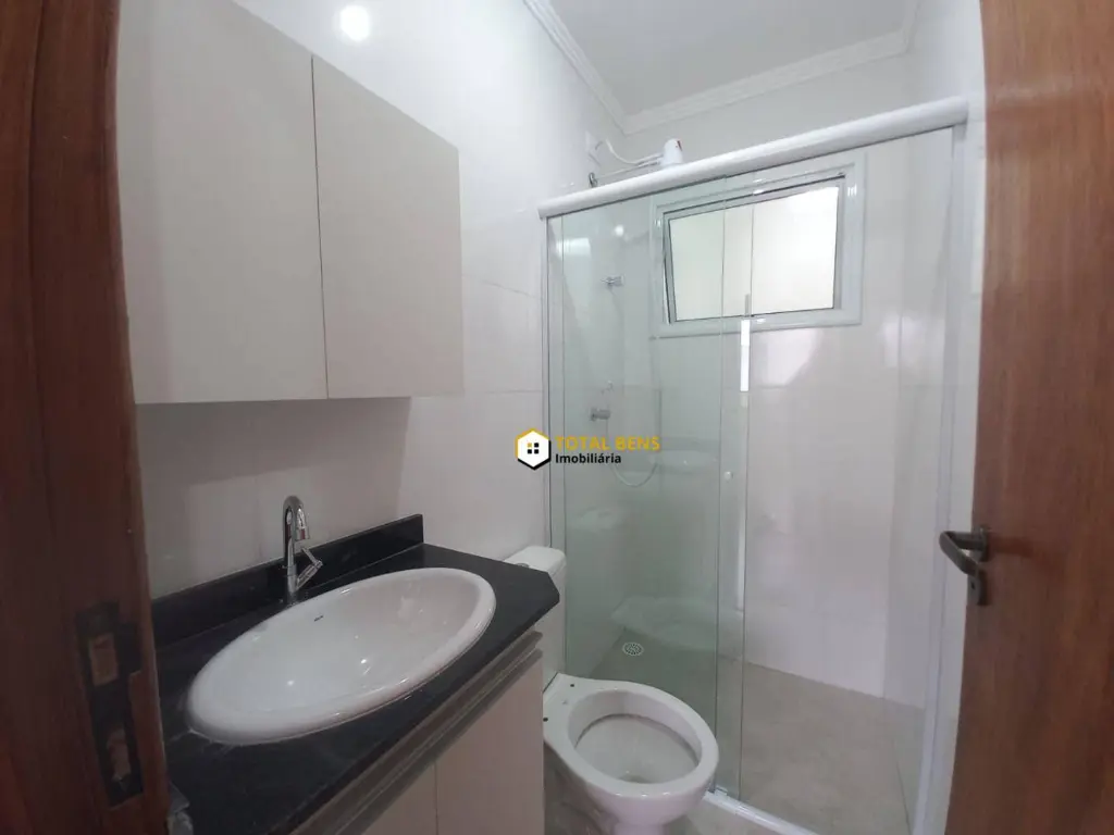 Banheiro completo com gabinete, armário e box de vidro.