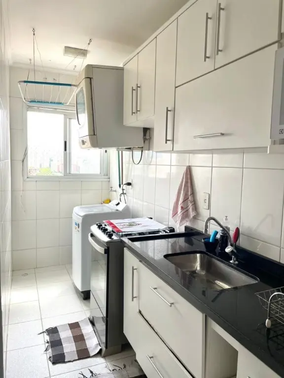 Cozinha já equipada com excelentes armários planejados e pia em granito São Gabriel preto - Lavanderia