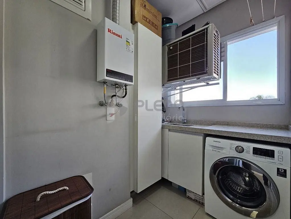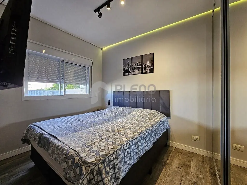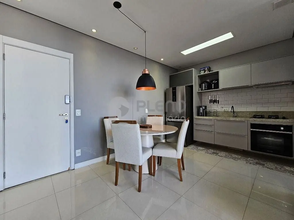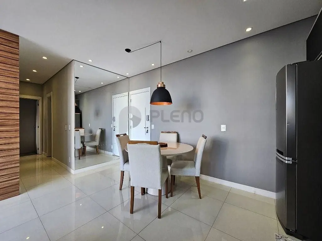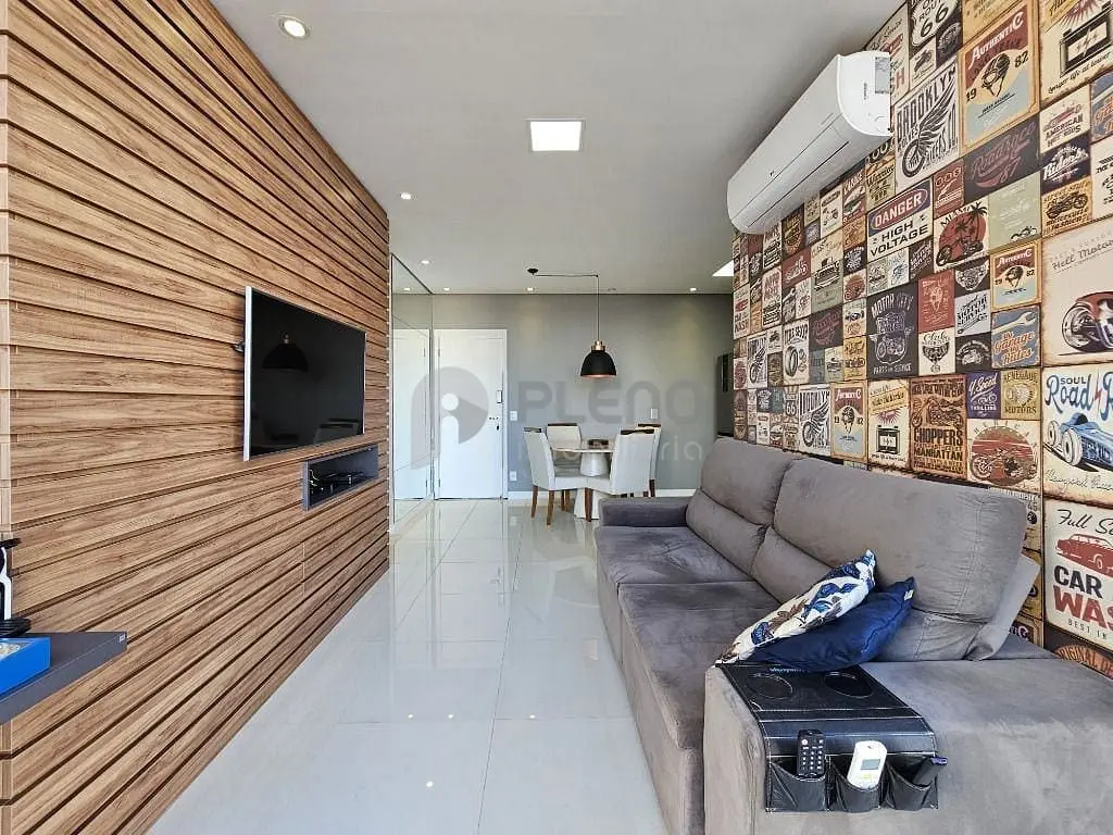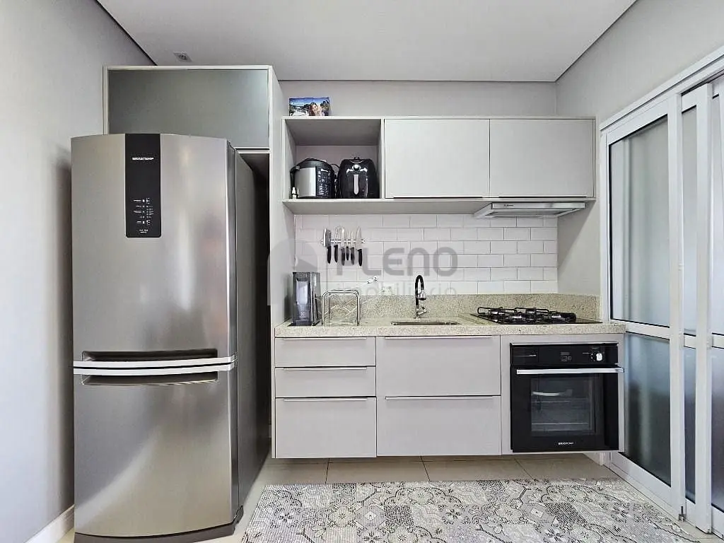 2 dormitórios com armários, banheiro social, sala para dois ambientes com varanda integrada com fechamento em vidro, cozinha equipada com depurador, cooktop, forno e armários, área de serviço com armários e 1 vaga de garagem.