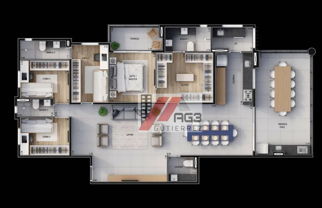 Esse apartamento possui uma planta 136m² distribuídos em 4 dormitórios sendo duas suítes, uma delas suíte master com closet e uma varanda privativa, mais 2 dormitórios com um banheiro social para servi-los, um lavabo, amplo living para 2 ambientes, uma espaçosa varanda gourmet e 4 vagas de garagem vinculadas e cobertas (sem sorteio e manobras de carro de vizinhos). A cozinha já integrada com a estrutura da sala completa o espaço interno tendo área de serviço fica mais isolada ao fundo. Os apartamentos serão entregues com a estrutura de automação para Alexa que podem ser usados para as lâmpadas, persianas e eletrodomésticos e também possuem toda estrutura para receber a instalação de ar-condicionado em todos ambientes e aquecimento de água a gás.