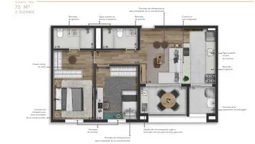 2 quartos - com 1 suite, persianas de enrolar, infraestrutura para ar-condiconado sala e quartos, infraestrutura para churrasqueira à gás, cozinha americana -