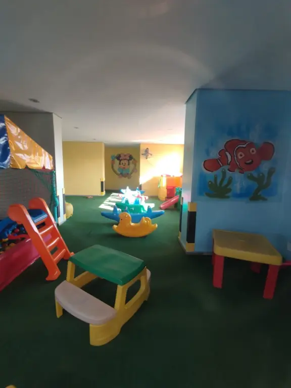O condomínio oferece uma infraestrutura completa com brinquedoteca, churrasqueira, playground, portaria 24 horas, quadra poliesportiva, sala de jogos e salão de festas.