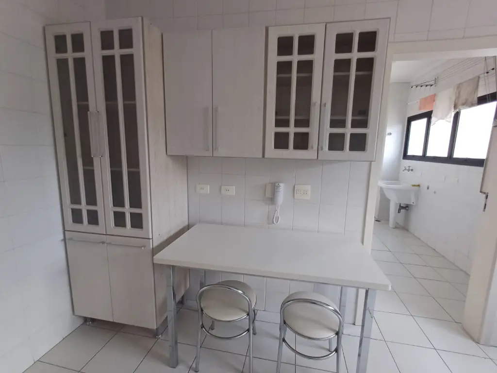 Cozinha planejada integrada à lavanderia e ao quarto de serviço